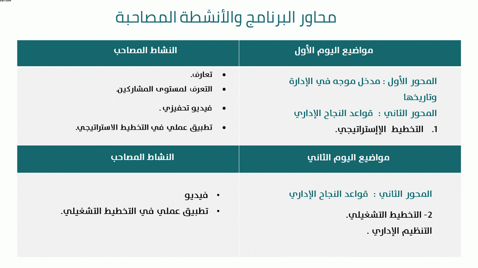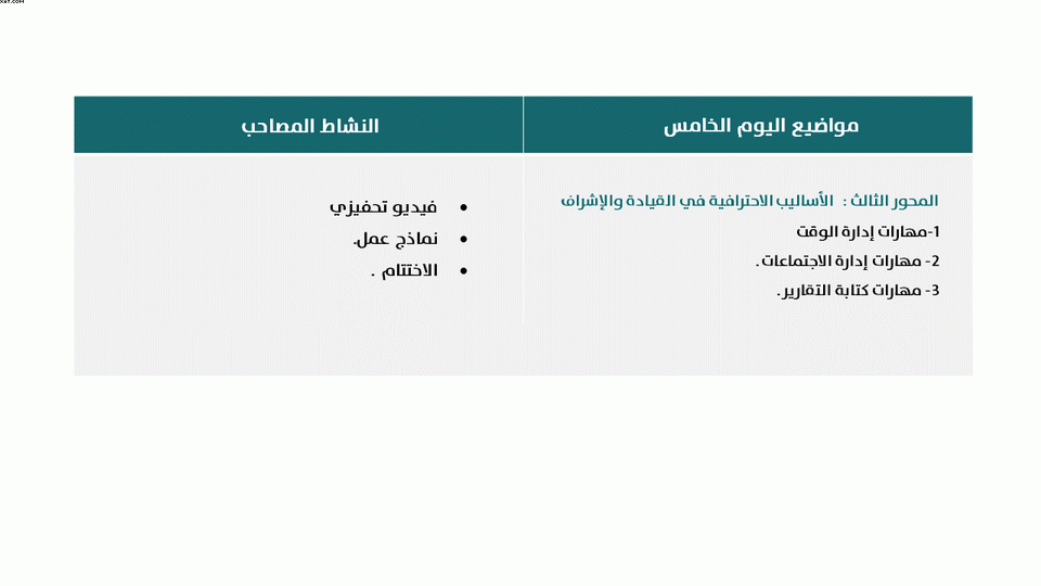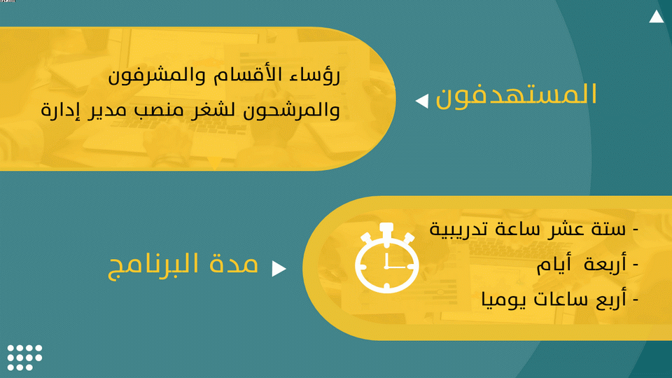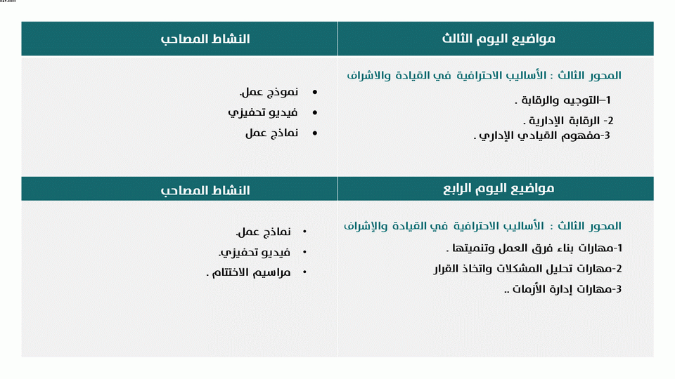 المدة: ستة عشر ساعة في أربعة أيام بمعدل أربع ساعات لليوم الواحد